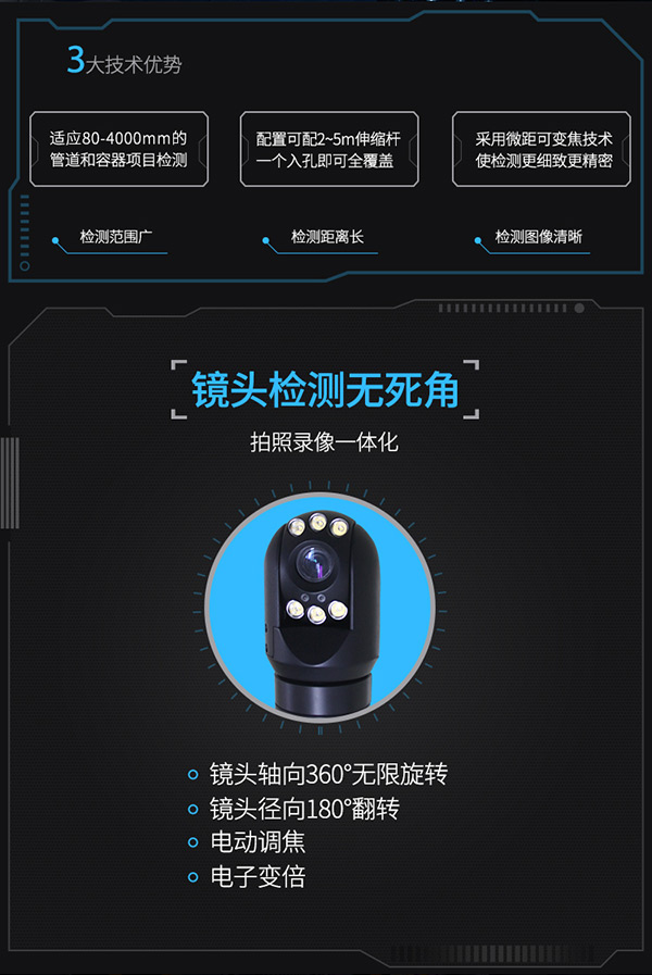 GT75BXA容器檢測內(nèi)窺鏡采用微型云臺彩色攝像鏡頭,搭配可伸縮性檢測桿(長度可定制),手持更方便,適用于80mm-1200mm的空間、管道及容器檢測項目。