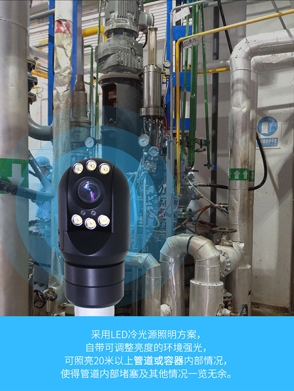 采用高亮度LED冷光源照明方案,可照亮50米以上的空間內(nèi)部情況,亮度可調(diào)節(jié),輕松應(yīng)對各種復雜檢測環(huán)境;十倍變倍功能,遠距離細節(jié)一覽無余,一鍵式操作高清晰圖像實時呈現(xiàn)。