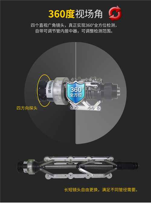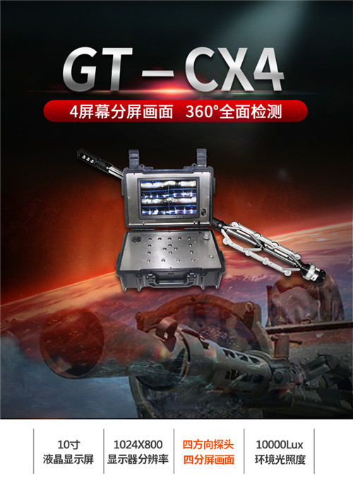 簡介——GT-CX4工業(yè)容器內(nèi)窺鏡可實現(xiàn)一屏四用的檢測效果,分屏檢測更加精細、全面,管道/容器內(nèi)部360°檢測無死角。自帶可調(diào)節(jié)