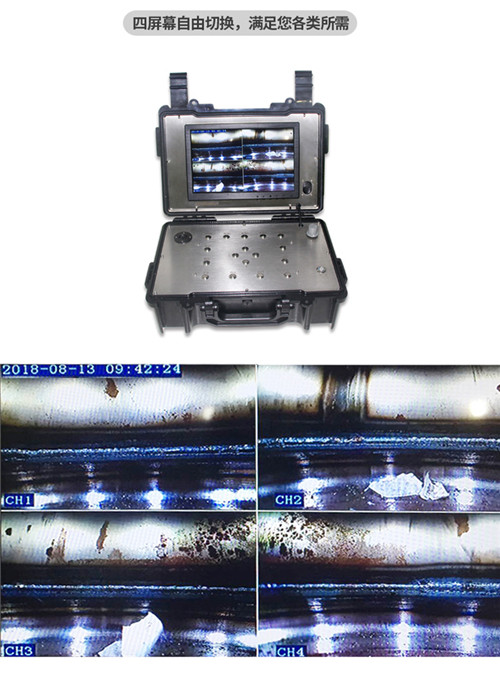 GT-CX4工業(yè)容器內(nèi)窺鏡可實現(xiàn)一屏四用的檢測效果,分屏檢測更加精細、全面,管道/容器內(nèi)部360°檢測無死角。自帶可調(diào)節(jié)LED光源照明,搭載居中器,確保在檢測過程中鏡頭處于管道或容器的居中位置,實用又方便。四屏幕自由切換,長短鏡頭可自主更換,滿足不同長度/高度/直徑的檢測需求。通過智能控制系統(tǒng)實時傳輸檢測畫面,拍照、錄像一體化操作更方便。