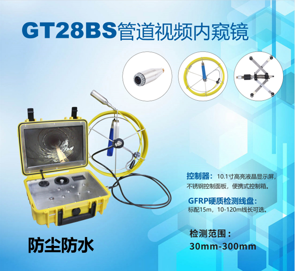 GT28系列管道內(nèi)窺鏡是一款多功能型內(nèi)窺鏡,10.1寸高清顯示智能控制器,10-50m材質(zhì)為GFRP檢測(cè)線可供長(zhǎng)距離檢測(cè)。直徑28mm電動(dòng)調(diào)焦鏡頭在管道內(nèi)部全方位觀察。