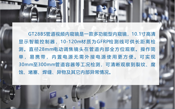 GT28BS工業(yè)管道內(nèi)窺鏡操作簡(jiǎn)單,攜帶便攜,內(nèi)置電源無(wú)需外接電源等眾多優(yōu)勢(shì)。可實(shí)現(xiàn)30mm至400mm的管道容器等工況檢測(cè),可清晰觀察到裂紋,腐蝕,堵塞,焊縫,異物及內(nèi)部異常情況。