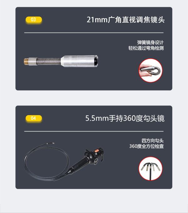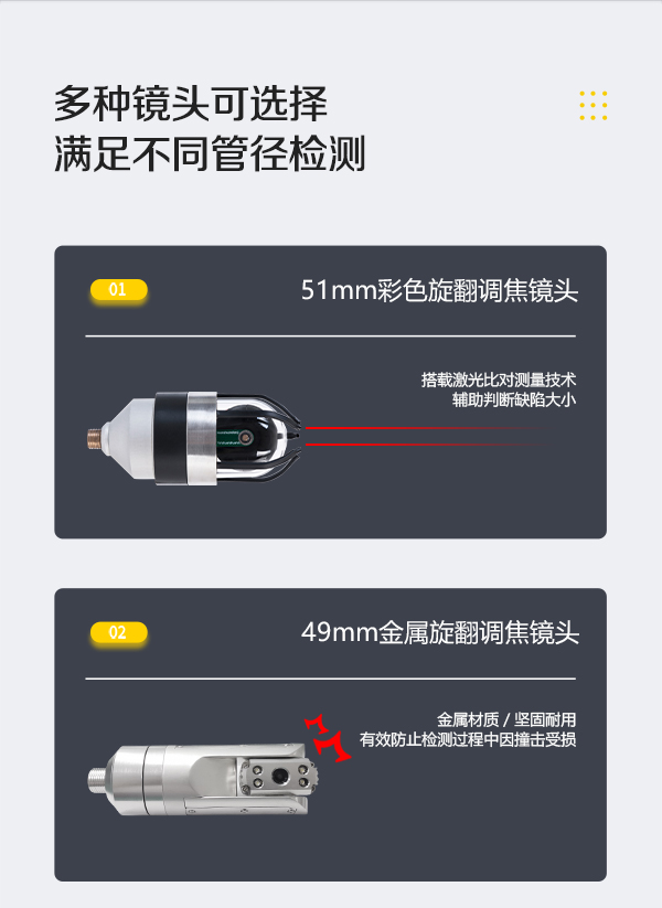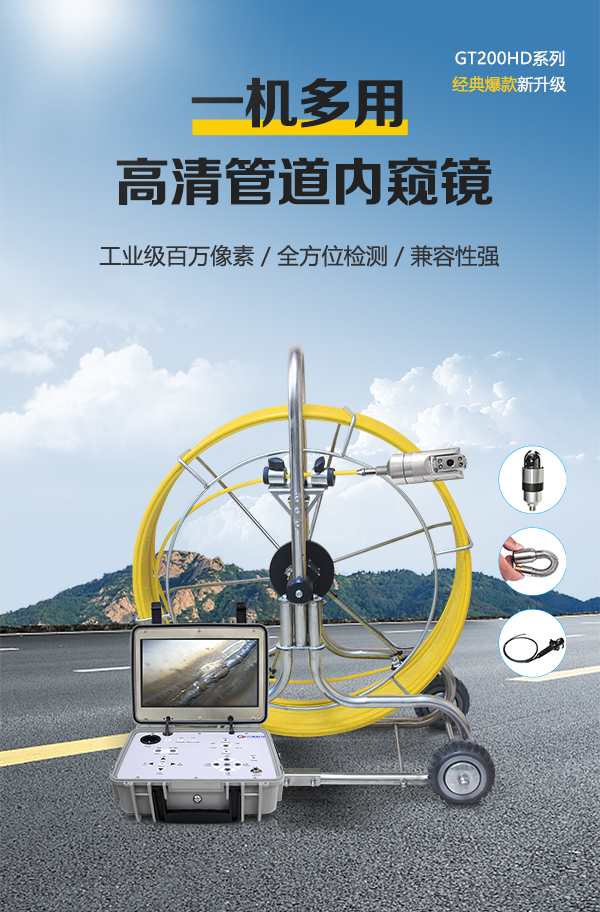 GT200HD系列高清工業(yè)內(nèi)窺鏡通過全景鏡頭在管道內(nèi)部的全方位觀察,將檢測(cè)圖像數(shù)據(jù)傳輸至控制主機(jī)。此外,搭配勾頭鏡可進(jìn)入狹窄彎曲的空間,輕松應(yīng)對(duì)各類復(fù)雜工況。鏡頭軸向360°無限旋轉(zhuǎn),徑向220°翻轉(zhuǎn),檢測(cè)無死角,HD高清畫面實(shí)時(shí)顯示內(nèi)部工況。適用于7-800mm直徑的管道、容器等工況檢測(cè),及時(shí)記錄并存檔工況內(nèi)部的裂紋、腐蝕、堵塞、焊縫、異物等缺陷。